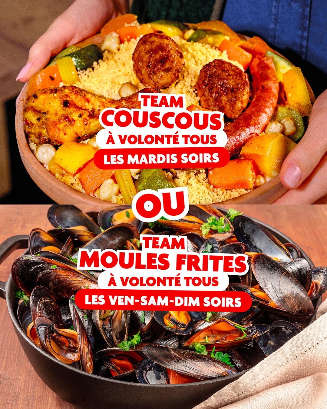 C’est le retour des soirées à volonté chez Flunch😃 Vous vous laisserez tenter par le couscous, les moules frites ou les deux ? 😉 #couscous #moule #avolonte #plat #nouveauté #soiree