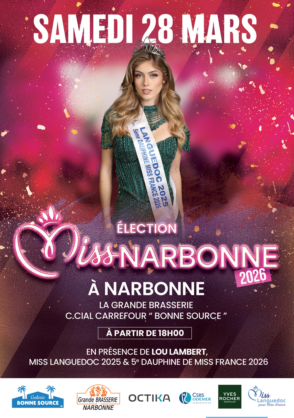Le samedi 28 mars dès 18h, rendez-vous à la Grande Brasserie du centre commercial Bonne Source pour l’élection de Miss Narbonne 2026 !